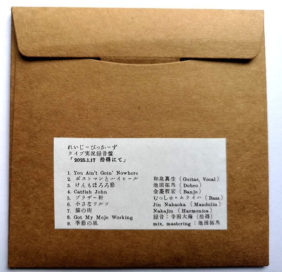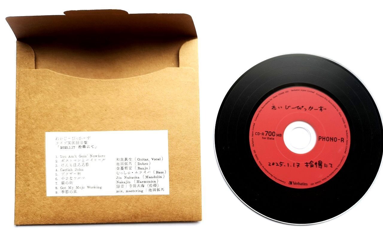 京都を拠点に活動する、ギター、バンジョー、ドブロからなるカントリーボーイ3人組・れいじーぴっかーずが、2025年にリリースしたライブアルバム。